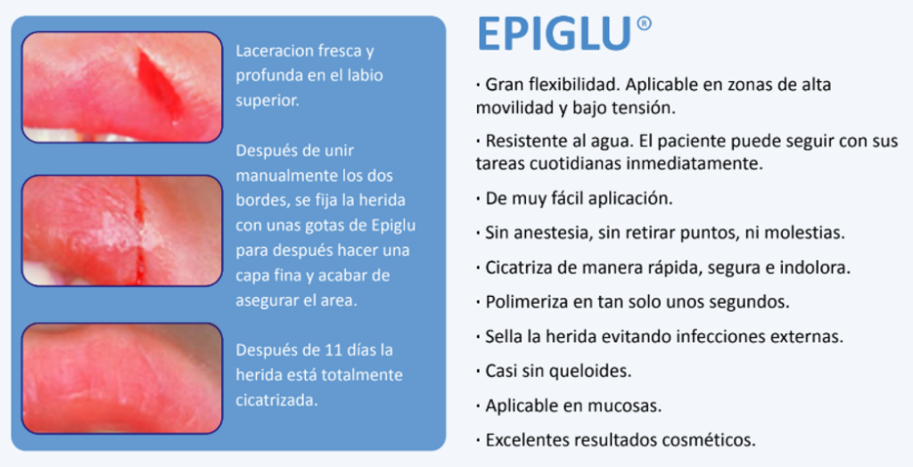 Adhesivo dérmico médico utilizado para el cierre de heridas, compuesto por cianoacrilato de etilo, un agente de rápido secado que permite un cierre eficaz de heridas y procedimientos quirúrgicos sin necesidad de suturas. Su fórmula acelera la cicatrización, reduce el riesgo de infecciones y mejora el confort del paciente al eliminar la necesidad de retirar puntos.